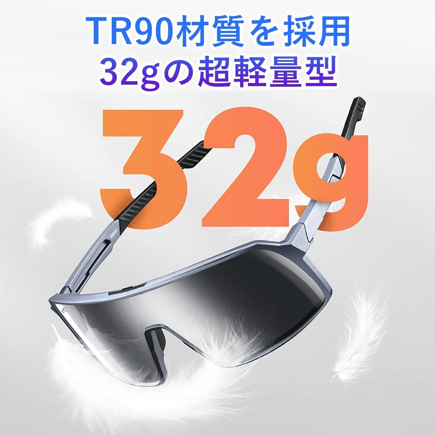 サングラスは運動中のいい掛け心地を実現するために、フレームは軽量で柔軟性があるTR90材料を採用し、わずか32gの重さです。長時間かけても鼻と顔に圧迫感はありません。TR96フレームは堅固な構造造形で、変形しにくく、強い耐衝撃能力を持ち、しかも品質が軽く、着用者に最も快適なフィット感を提供します。