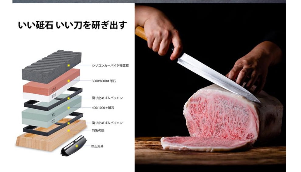 砥石 セット 包丁研ぎ石 両面砥石 包丁研ぎ砥石400/1000、3000/8000荒砥 中砥 仕上げ砥石 滑り止め竹砥石台 修正 砥石面 直し 角度固定ホルダー付き砥石 | VETEJO(VETESA女士)